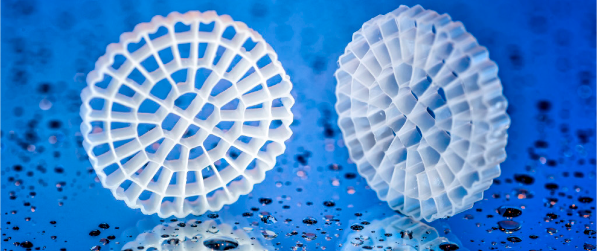 The core of an MBBR system is comprised of its biofilm carrier elements. These carriers are made from polyethylene and are designed to provide a large protected surface for the bacteria culture that facilitates the removal of biochemical oxygen demand (BOD), ammonia and nitrogen. To achieve this, the carrier elements, which have a density slightly below that of water, are kept suspended in the water by air from the diffusers in the aerobic reactors and by means of a mixer in the anoxic reactors. Thanks to this approach, MBBR systems can perform effectively across a spectrum of applications, including use as a sole bio-treatment, a pre-treatment and a post-treatment.